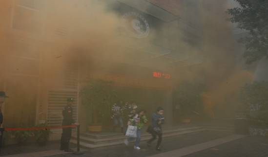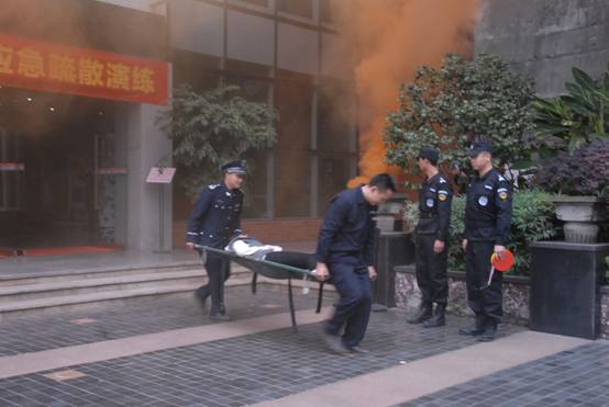 15点25分,随着烟雾弹升起和应急警报的响起,大正物业十几名特勤队员与物业人员,按照各自的分组情况跑到各自负责的疏导点,辅导员老师也到各楼层拐角处进行疏导,各班学生在当堂任课中外教师和班级干部的指引下,快速、有序地跑出教室,弯着腰,捂着口鼻,自动成列跑下楼梯,从学院大厅主入口和副入口两个安全口,奔向安全地点,同时大正物业灭火组身穿消防服,利用水带进行场面控制,抢险组顺利的将受伤学生抬出,疏散组进行有序疏散。在短短1分钟时间,顺利完成疏散逃离演练,没有出现一位师生受伤,演练取得了圆满成功。