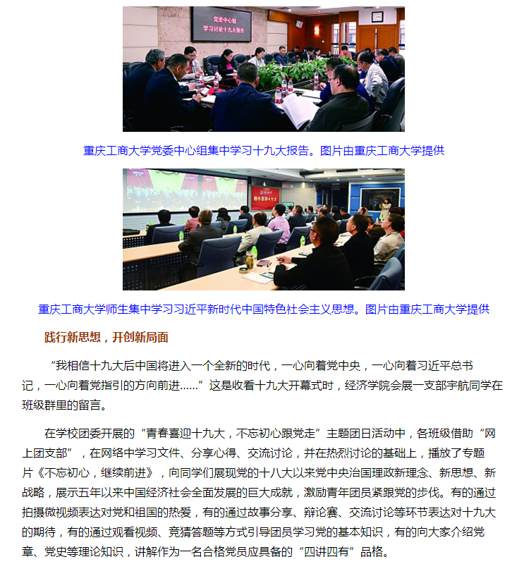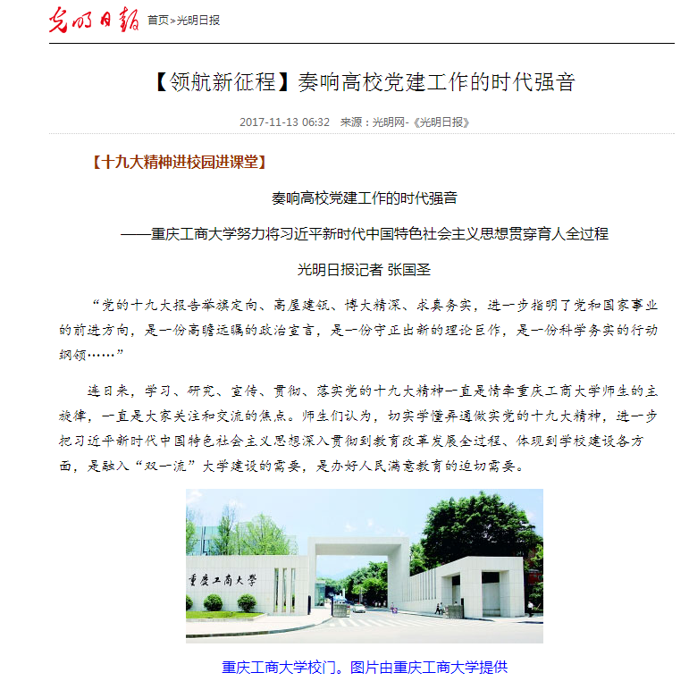 《光明日报》2017年11月13日08版“领航新征程”奏响高校党建工作的时代强音板块,发表了题为《十九大精神进校园进课堂》的文章,专题报道了必赢bwin线路检测中心努力学习将习近平新时代中国特色社会主义思想贯穿育人全过程。 文章从“践行新思想,开创新局面、坚持立德树人,增强思政课吸引力感染力和注重用心用情,将思政教育贯穿育人全过程”三个方面进行了详细阐述。