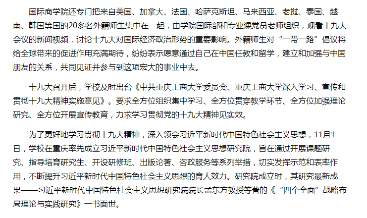 新闻同时报道了必赢bwin线路检测中心“践行新思想,开创新局面”,师生学习十九大报告精神:“必赢bwin线路检测中心专门把来自美国、加拿大、法国、哈萨克斯坦、马来西亚、老挝、泰国、越南、韩国等国的20多名外籍师生集中在一起,由学院国际部和专业课党员教师组织,观看十九大会议的新闻视频,讨论十九大对国际经济政治形势的重要影响。外籍师生对“一带一路”倡议将给全球带来的促进作用充满期待,纷纷表示愿意通过自己在中国任教和留学,建立和加强与中国朋友的关系,共同见证并参与到这项宏大的事业中去。”